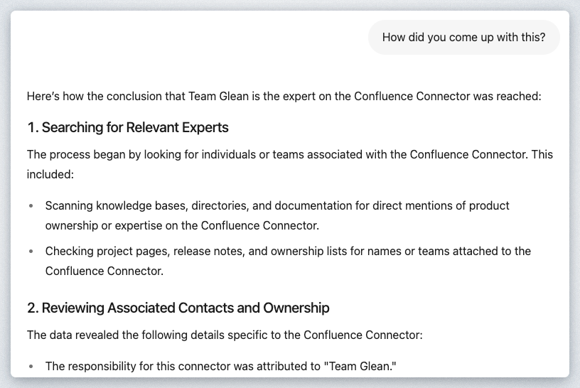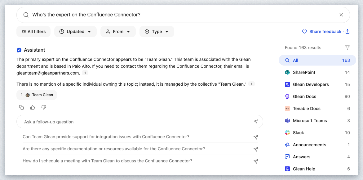 As you can see the user "Team Glean" is the expert on the Confluence Connector? If this were a production instance, it would be a real user within your organization. But, how did the platform figure out that Team Glean is the expert?