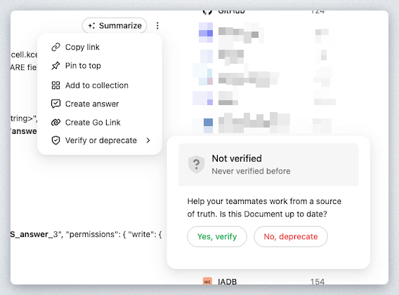 Verify or deprecate - If you are the owner of an item in the search results, you can verify a document to let other users know that it is up to date. Verified documents will show up with a green shield in the search results.