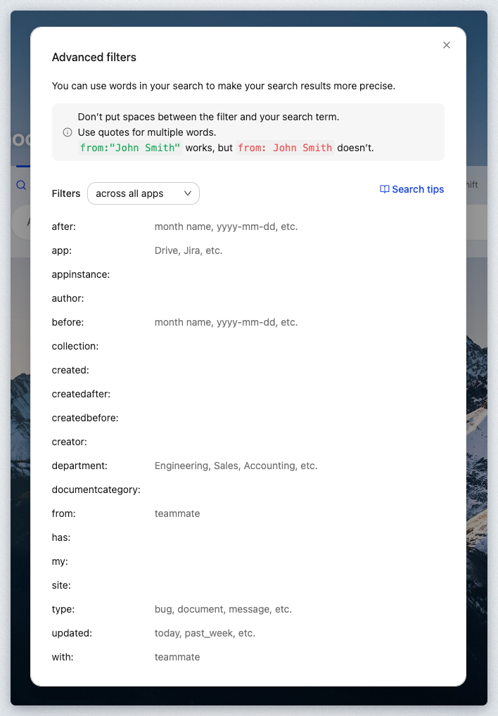 Glean's advanced search filters enhance the precision and relevance of search results. Click on the icon ⓘ to find the advanced search details as shown.