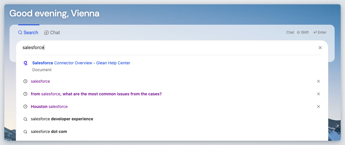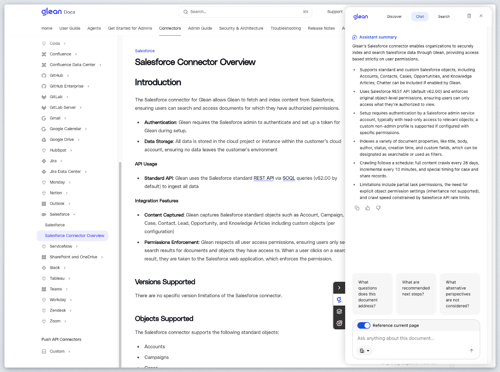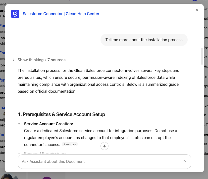 You have been redirected to Glean's Public Help Docs on https://docs.glean.com. Specifically the help document surrounding the Salesforce Connector. You can of course read this document as necessary. But the purpose of having you accomplish this is to show another feature of the Glean Platform that is affectionately known as "Glean Where you Work"