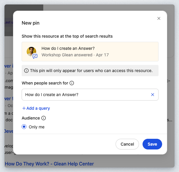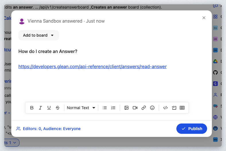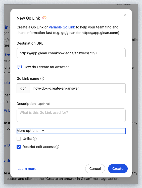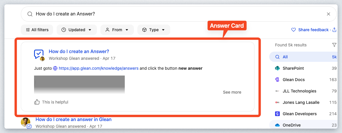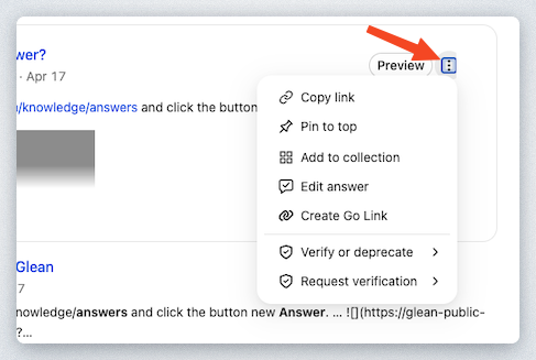 Create Answer - Answers are bite-sized chunks of information you create in Glean to answer common questions your teammates - and future teammates - might have. This will show up for content that isn't already an Answer.