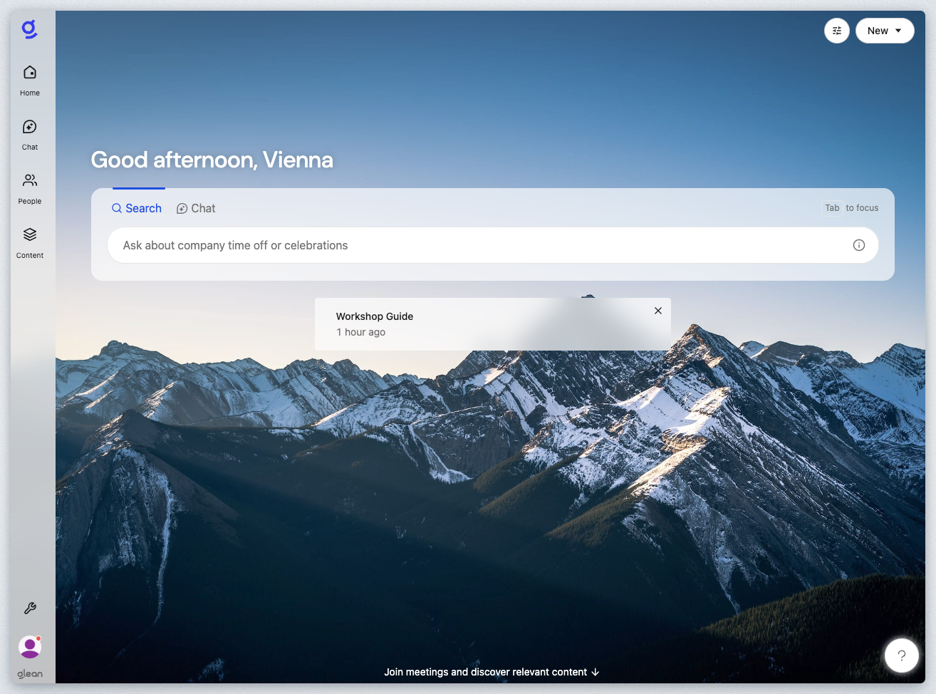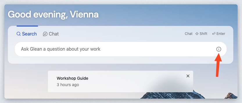 If you don't see the Glean Search page of the Home page, click on the logo of the Home icon in the top left corner of the screen.