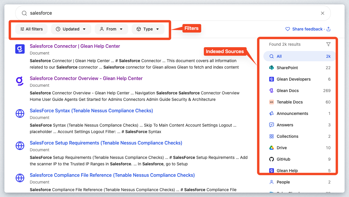 As users search for content and interact with the different options available, this provides signals back to Glean that help improve the search results as well as Glean Knowledge Graph.