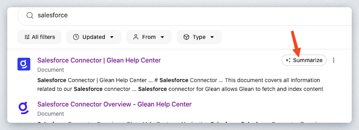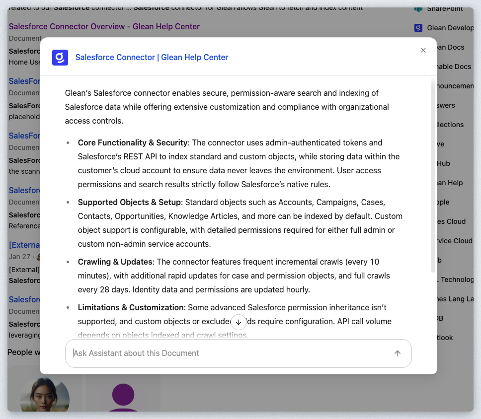 Click the "Summarize" button when you hover over the "Salesforce Connector Overview | Glean Help Center" Glean Developers document. A popup window will present itself similar to the following: