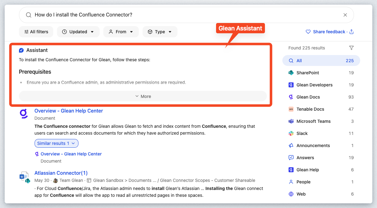Tight integration between the search engine results page (SERP) and the Glean Assistant drives deep value for Glean Customers. We'll learn more about the Glean Assistant in an upcoming section and workshop module.