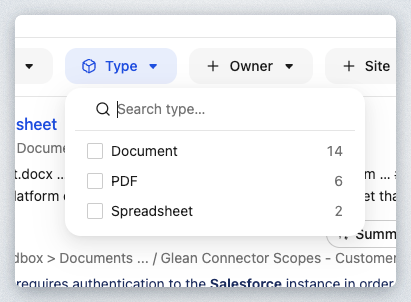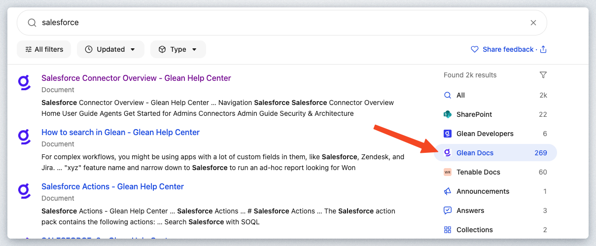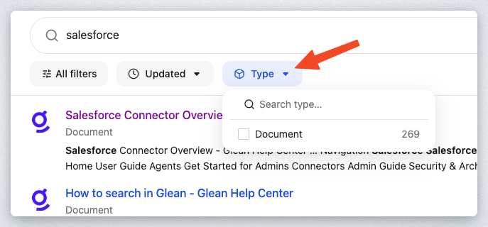 Notice how the search results are just showing documents from the Glean Docs website now. What started as 2,000 results is now filtered down to 269 results. Next, click on the Type filter under the search box.