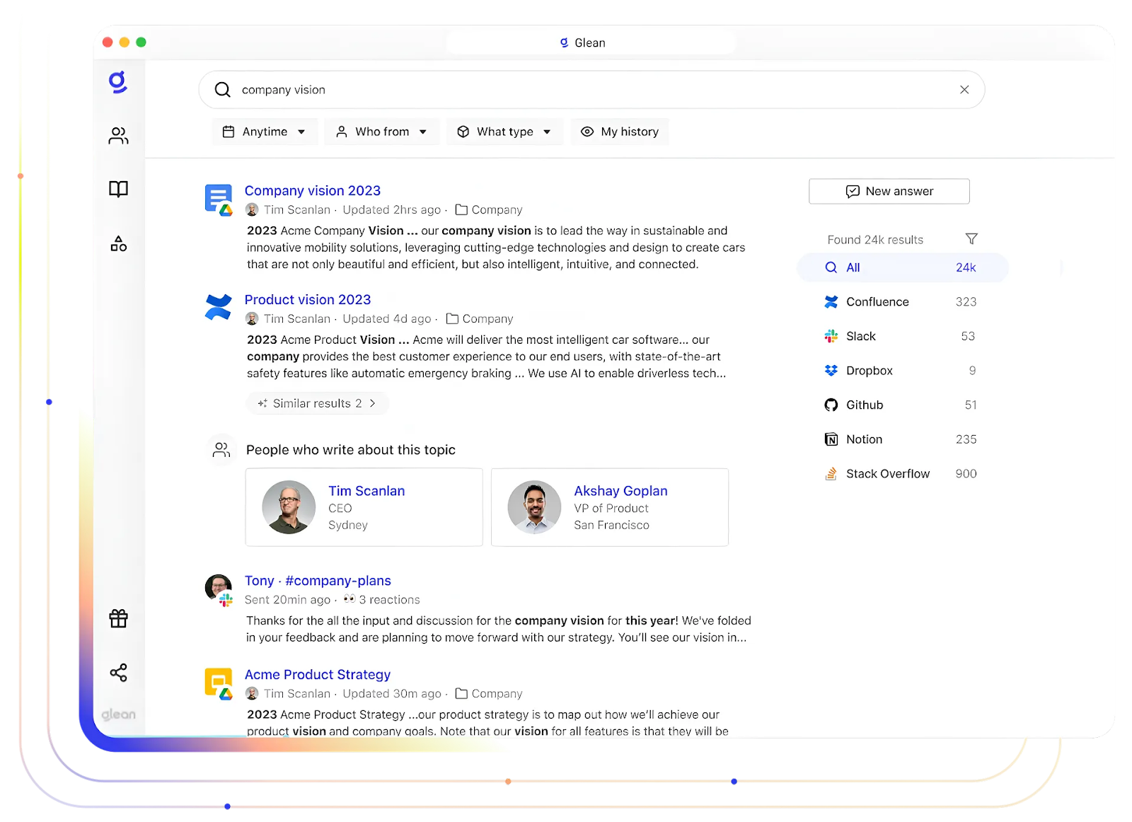 Together, these features showcase how Glean transforms enterprise search from a basic query tool into an intelligent knowledge platform that seamlessly integrates with daily work processes.