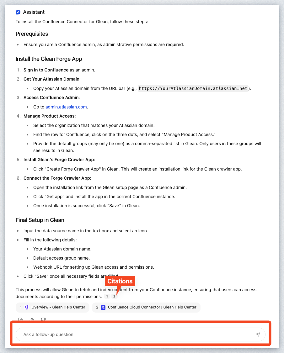You can now see the full Glean Assistant answer and are able to fully interact with the Assistant directly from the SERP. You can provide feedback on the generated answer, ask follow-up questions/clarifications as necessary, and see citations as you learned in the previous lab.