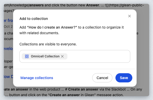Add to Collection - Collections are an easy way to organize related documents across all your tools by a single topic. You can think of them as a way to curate a set of documents for other teammates to find and use easily.