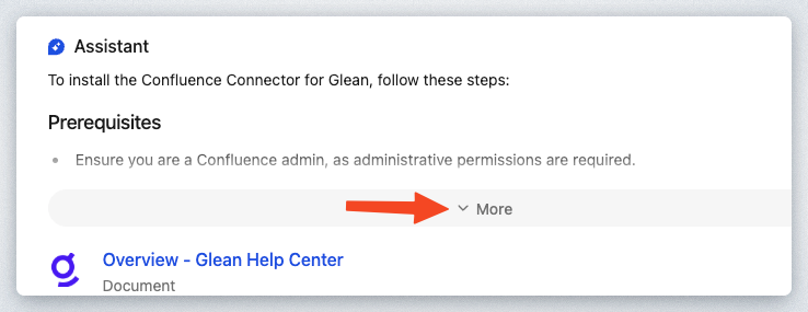 Expand the Glean Assistant answer by clicking the More button at the bottom of the Assistant Card.
