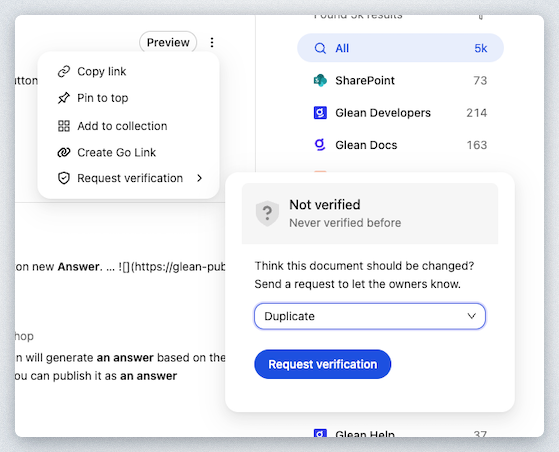 Request Verification - When you're using Glean to search for documents across different tools in your company, Glean's Verification feature makes it easy to know if a document is verified. If the document is a duplicate, incorrect, incomplete, outdated, or other; you can ask for someone to verify it.