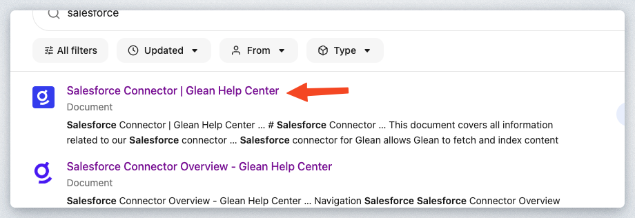 In the SERP, click the "Salesforce Connector Overview | Glean Help Center" document as shown below to open it in a new tab.